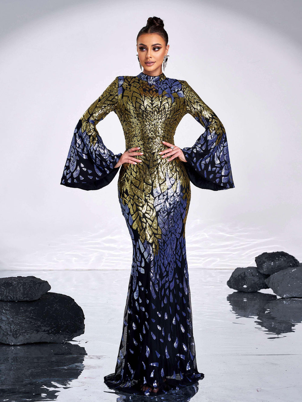 Be the center of attention in our Backless Bell Sleeve Sequin Formal Dress! The stunning sequin detailing and elegant bell sleeves will make you shine at any formal event. With a flattering backless design. this dress is perfect for making a statement and feeling confident. Upgrade your wardrobe with this must-have piece.
