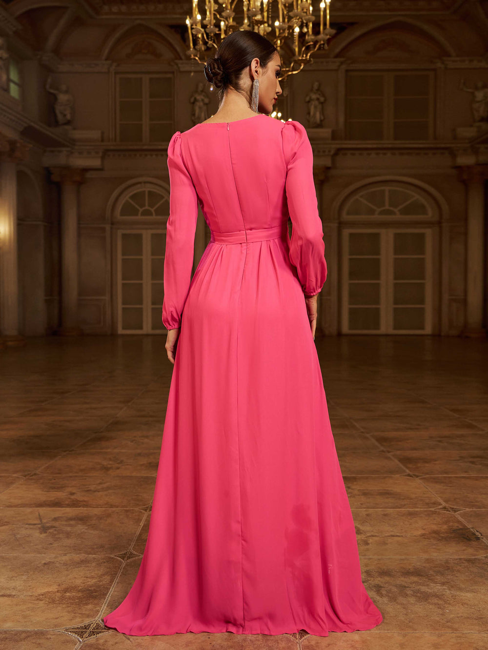 This formal V-neck A-line rose red chiffon prom dress XJ402 is the perfect choice for a truly special occasion. Crafted from delicate chiffon with an elegant V-neckline. its timeless A-line silhouette is offset with the romantic hue of classic rose red.