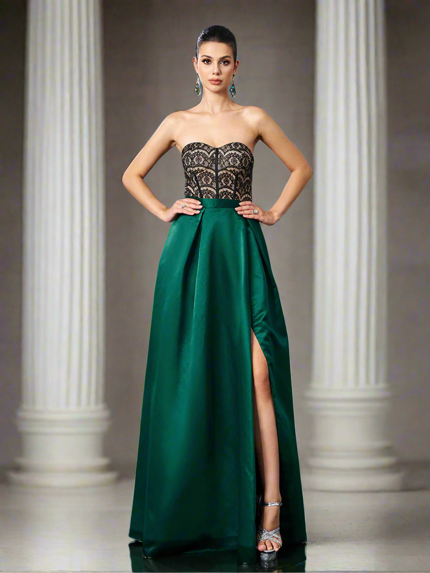 Detail:Strapless. Backless. A-line. Split. Lace Panel