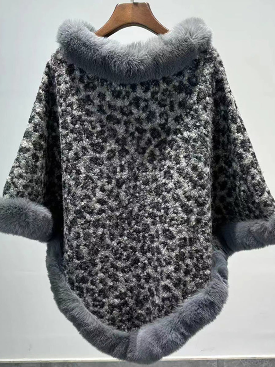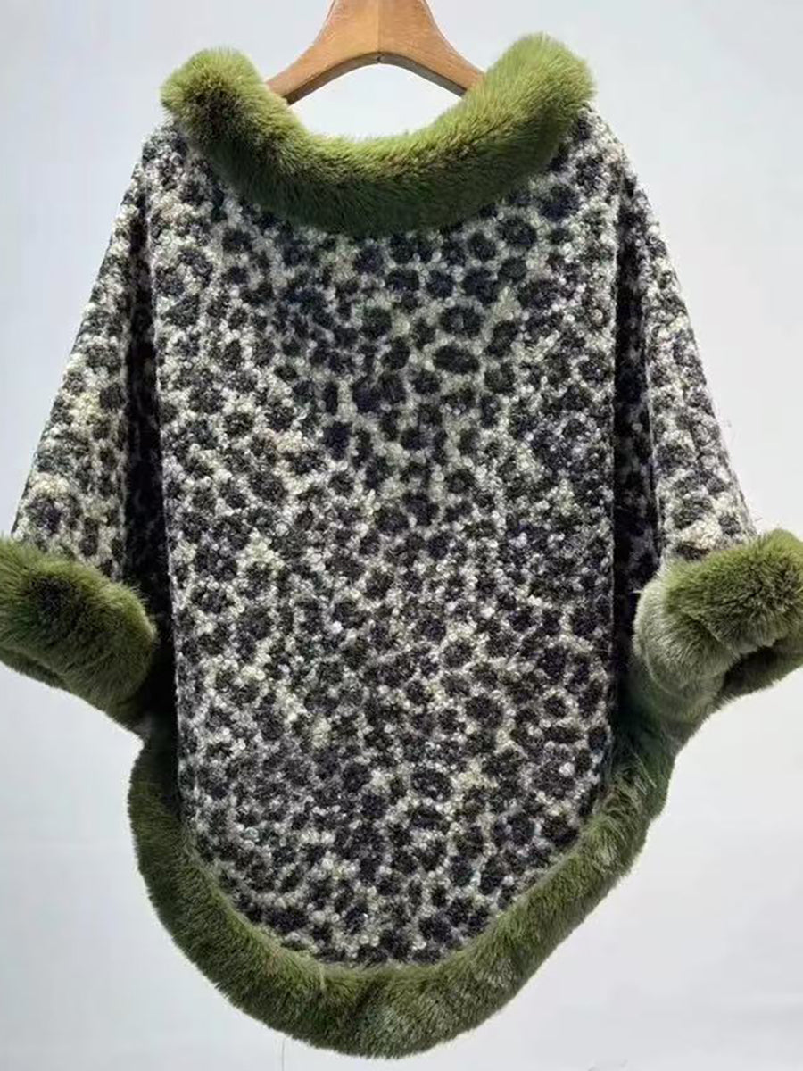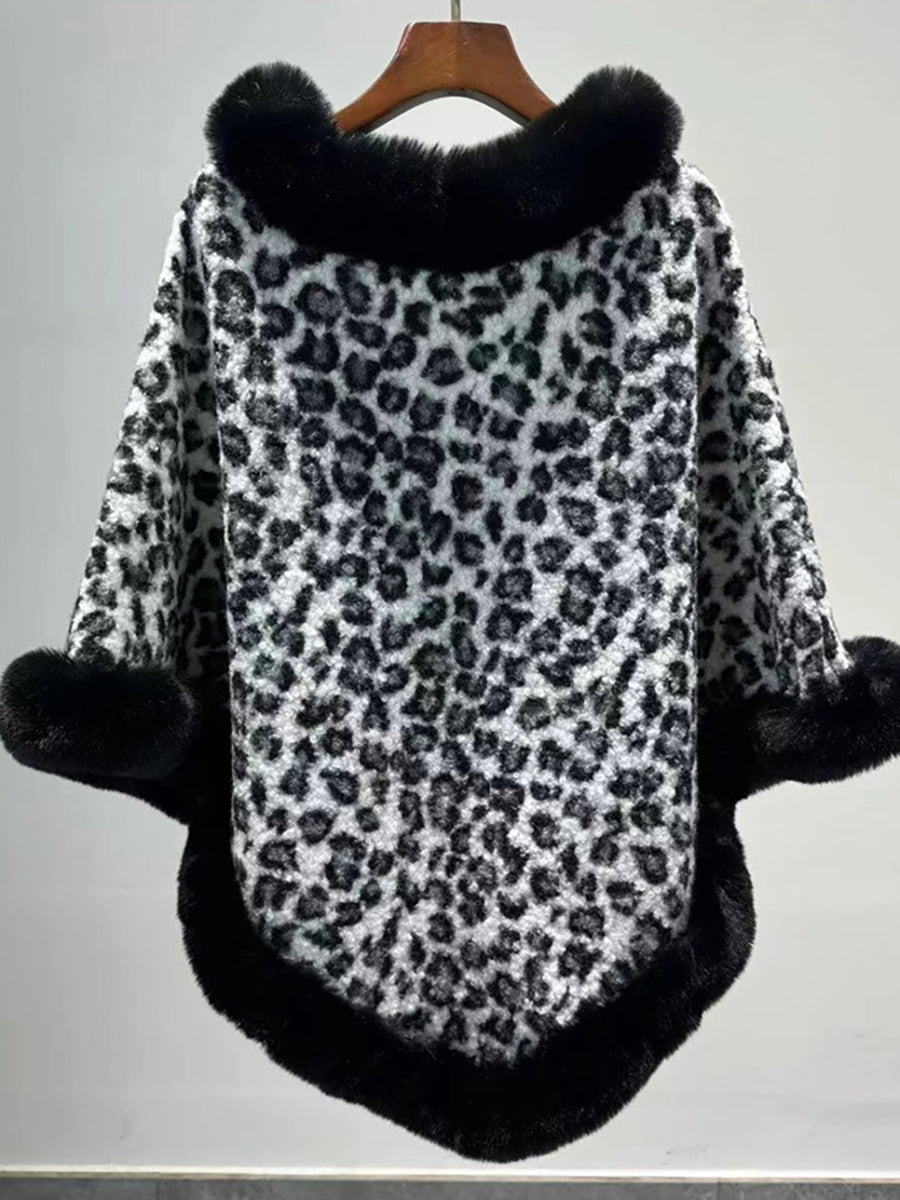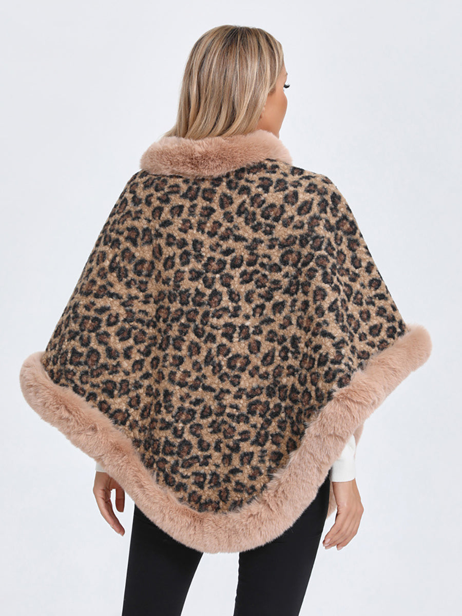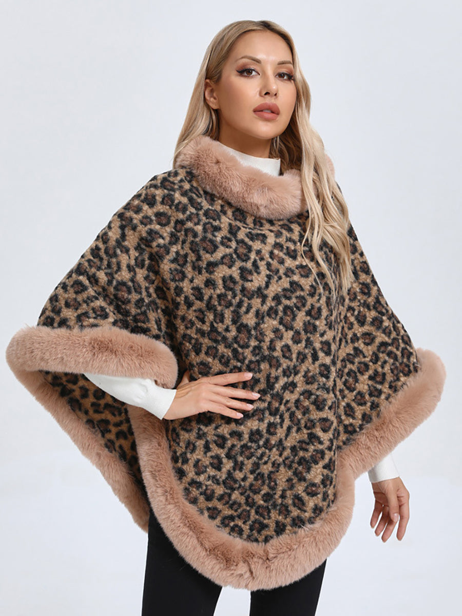 Wrap yourself in cozy elegance with this Leopard Print Faux Fur Trim Knitted Poncho Shawl. Its soft knitted fabric ensures warmth. while the stylish faux fur trim adds a touch of fierce sophistication. Perfect for layering. this poncho effortlessly elevates any outfit. combining comfort and trend-setting design for a chic. confident look wherever you go.
