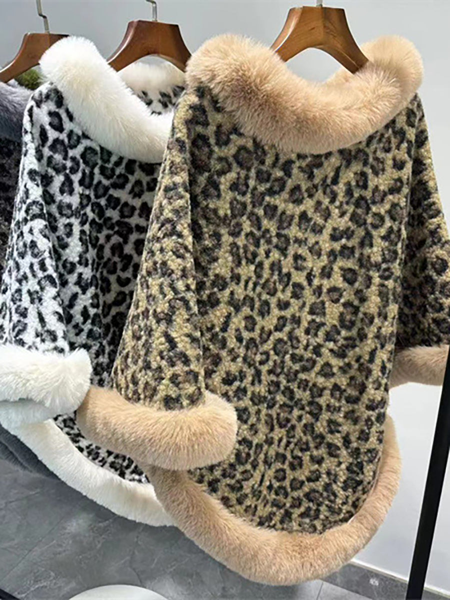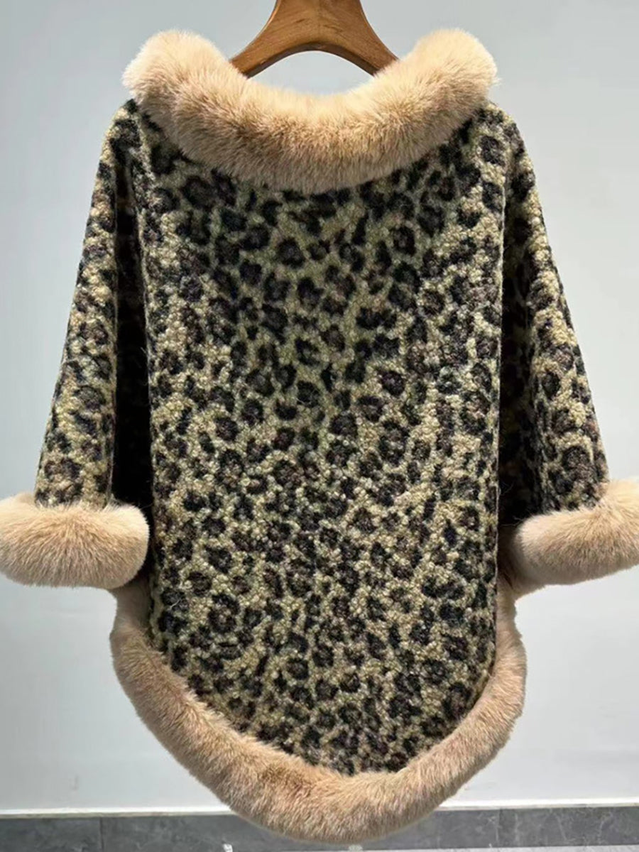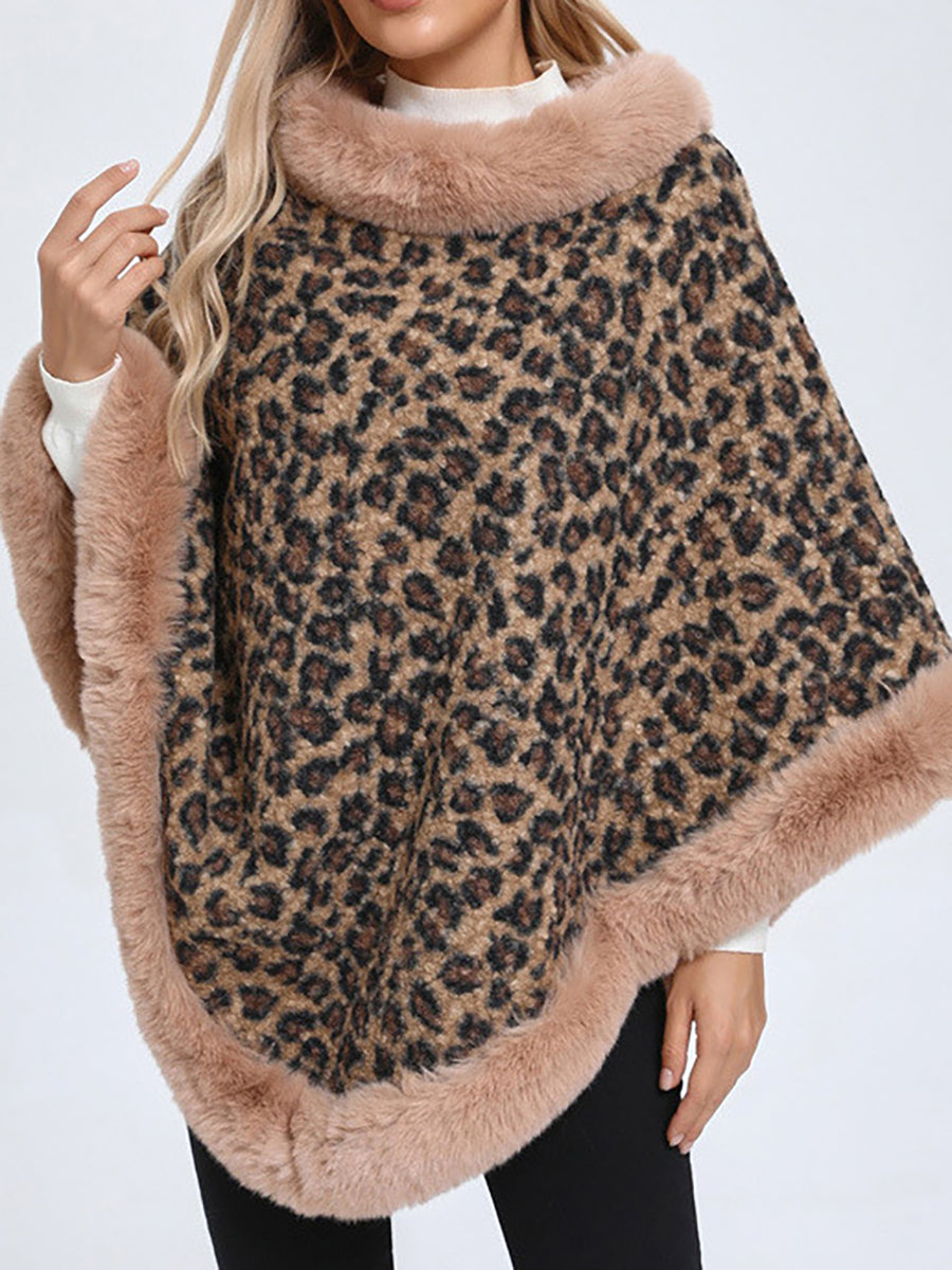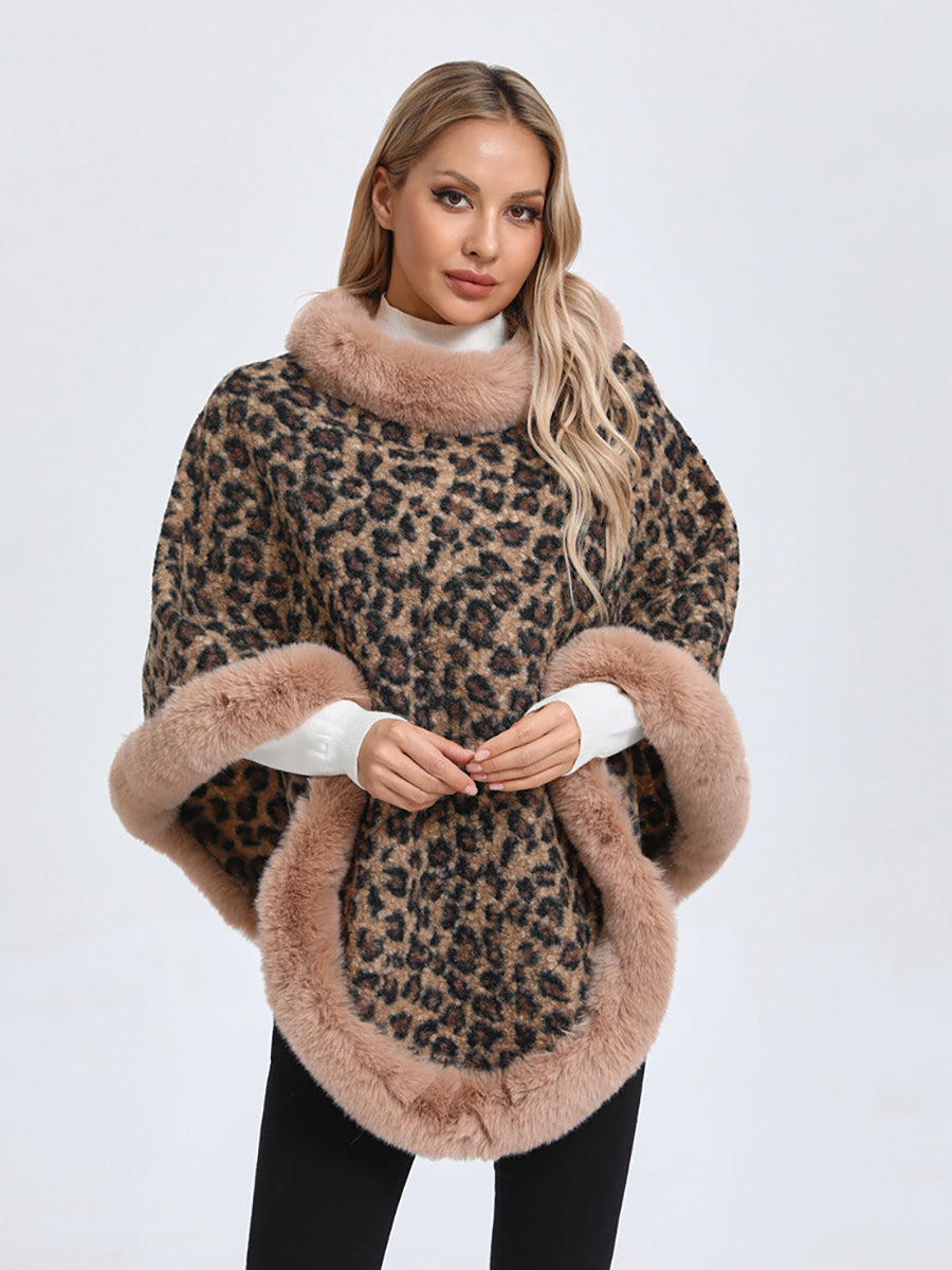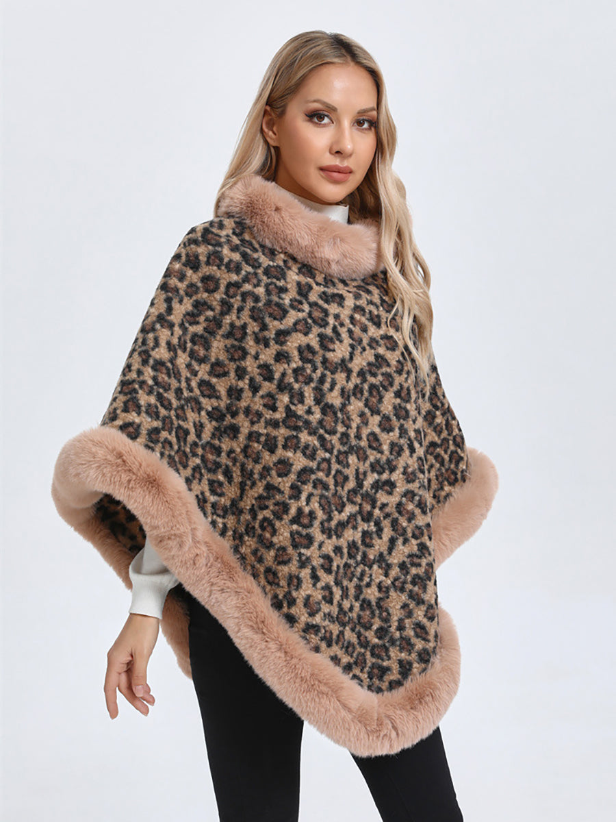 Wrap yourself in cozy elegance with this Leopard Print Faux Fur Trim Knitted Poncho Shawl. Its soft knitted fabric ensures warmth. while the stylish faux fur trim adds a touch of fierce sophistication. Perfect for layering. this poncho effortlessly elevates any outfit. combining comfort and trend-setting design for a chic. confident look wherever you go.