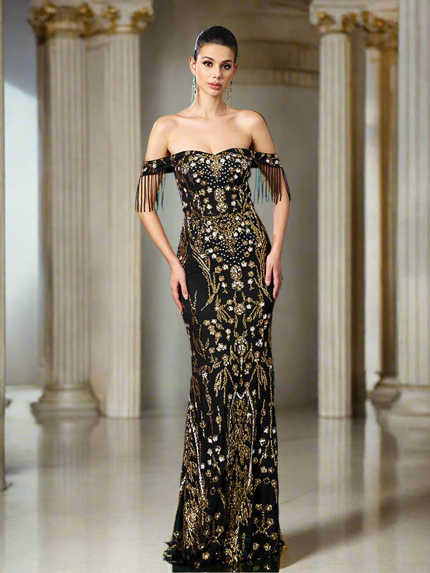 Detail:Off Shoulder. Fringed. Mermaid. Backless