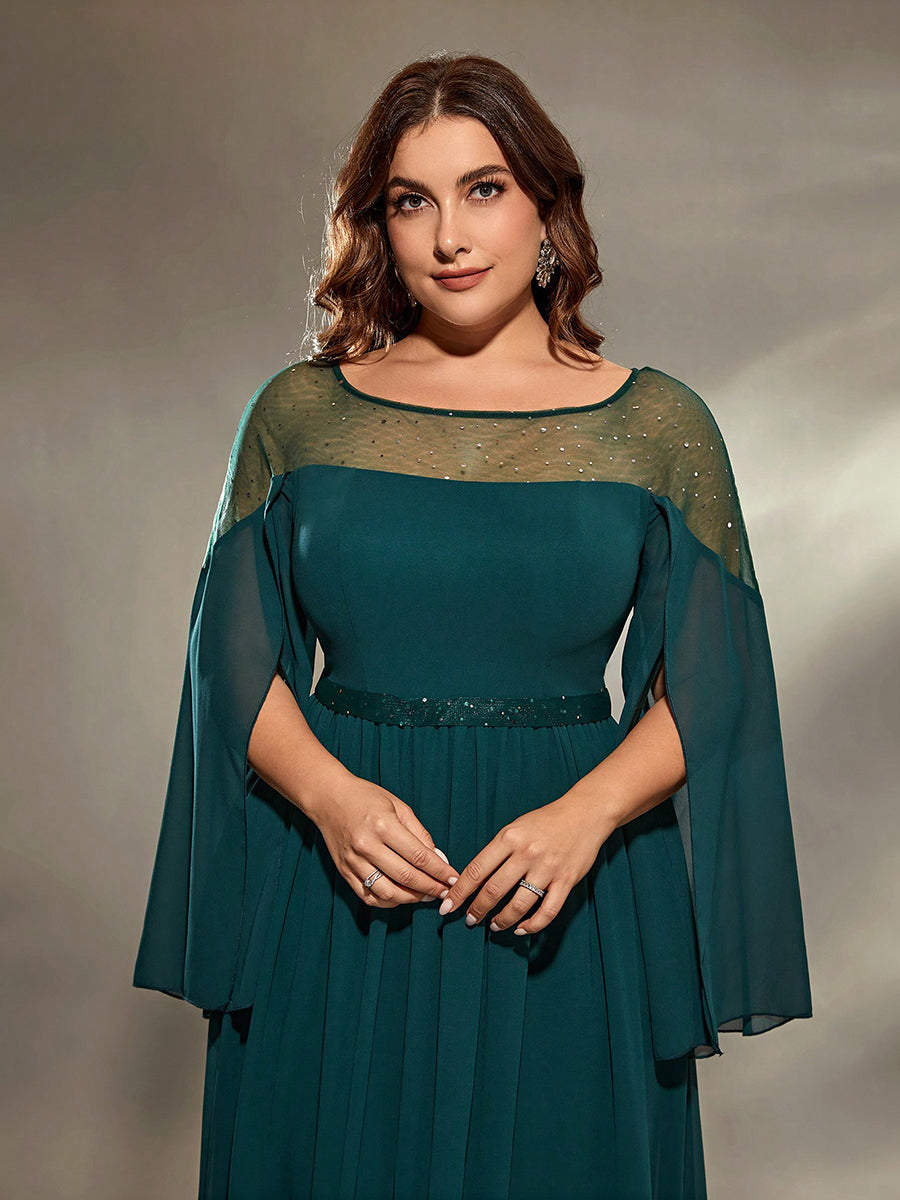 Elevate your evening look with this Plus Size A-Line Prom Dress in elegant green. Featuring a flattering round neck and shimmering rhinestone accents. it adds just the right amount of sparkle. The split chiffon sleeves offer graceful movement and a touch of drama. while the flowing A-line silhouette ensures comfort and sophistication. Perfect for making a memorable entrance at any special occasion.