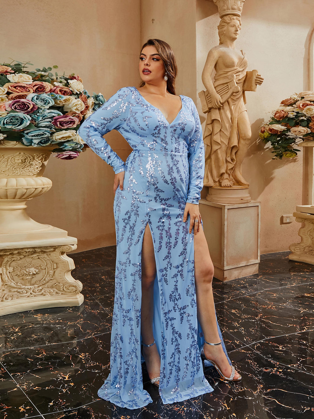 Turn heads at prom in this V-Neck Backless Mermaid Split Long Sleeve Prom Dress. Its sleek. form-fitting mermaid design features a stunning V-neckline. long sleeves and a show-stopping split. Make a statement and look exquisite in this timeless classic.