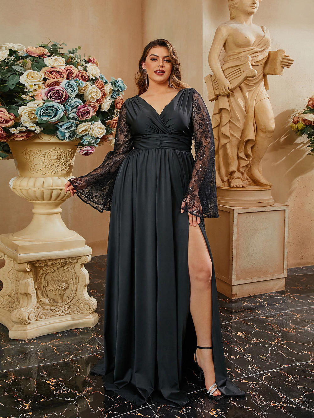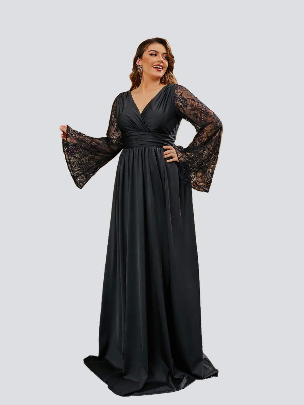 This Plus Size Wrap Evening Dress is perfect for a formal occasion. Featuring soft black fabric. subtle ruching. and delicate lace sleeves. this dress creates a shapely silhouette that flatters your curves. Expertly tailored with a wrap waistline. this dress flatters all body types.