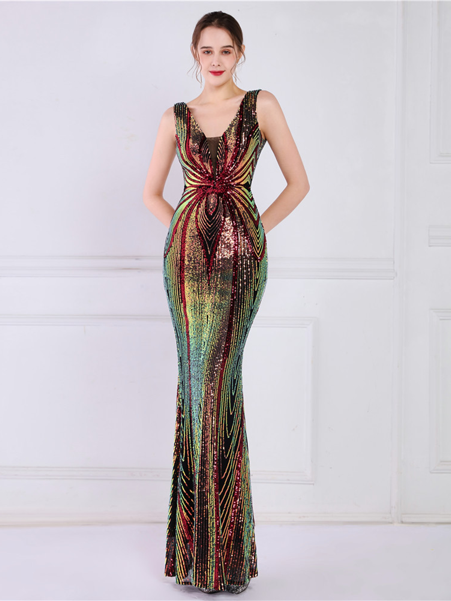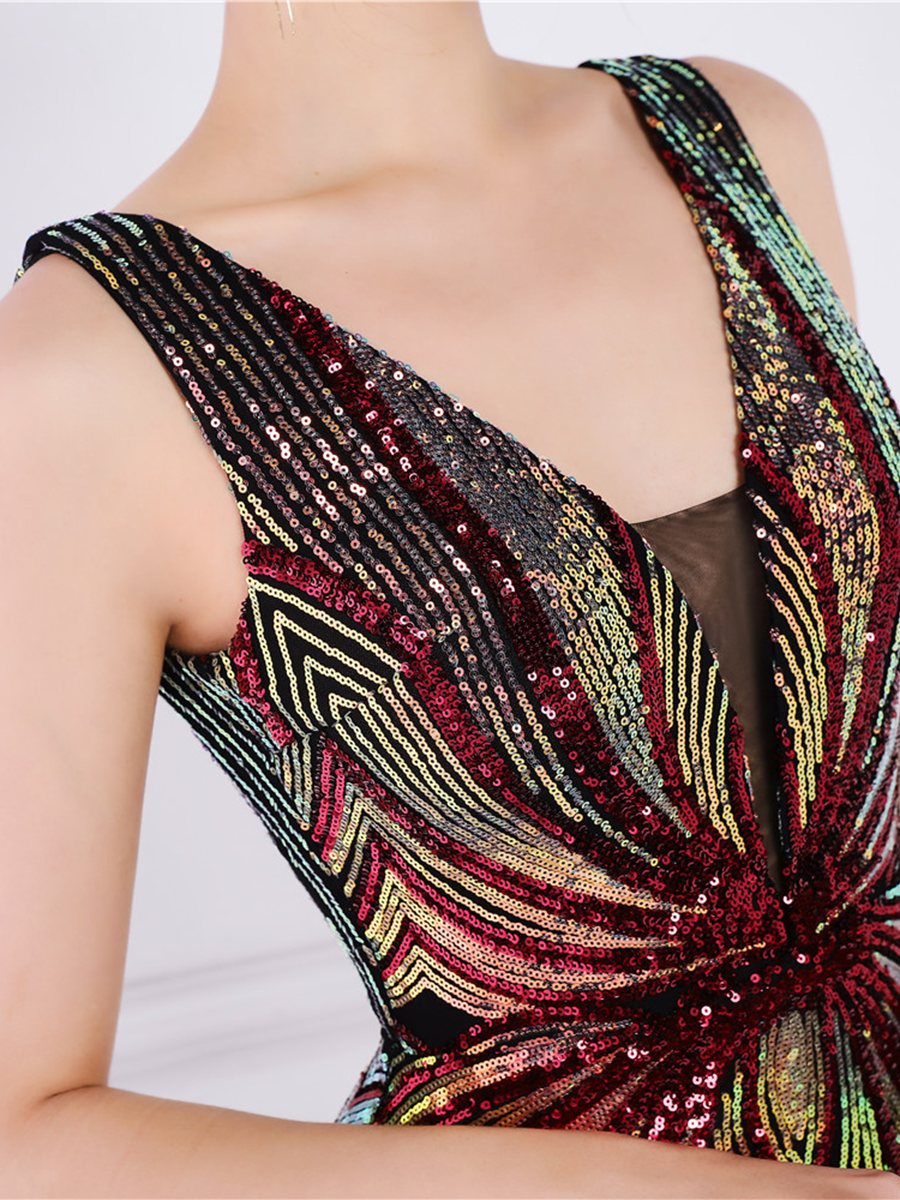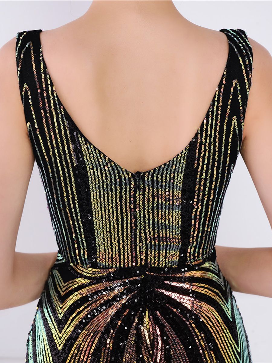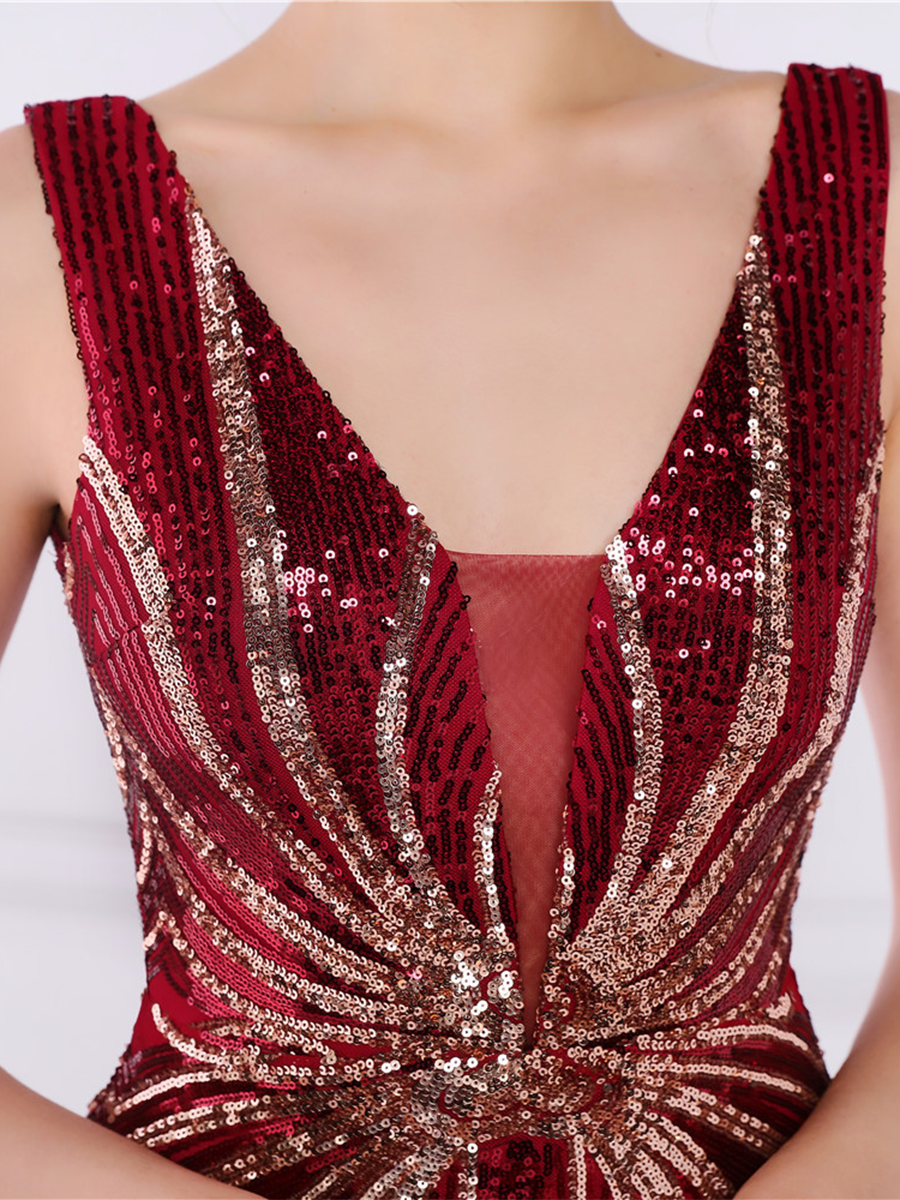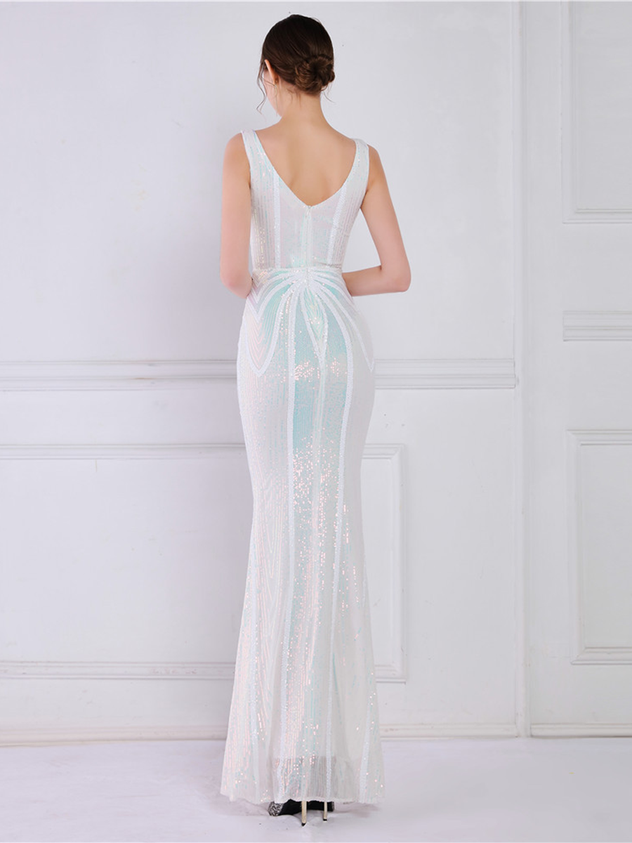Steal the show in this Sequin Graphic V-neck Prom Dress. With dazzling sequins and a flattering V-neckline. this dress is sure to make heads turn. Perfect for prom. weddings. or any special occasion. Shine bright and sparkle on with this stunning dress!
