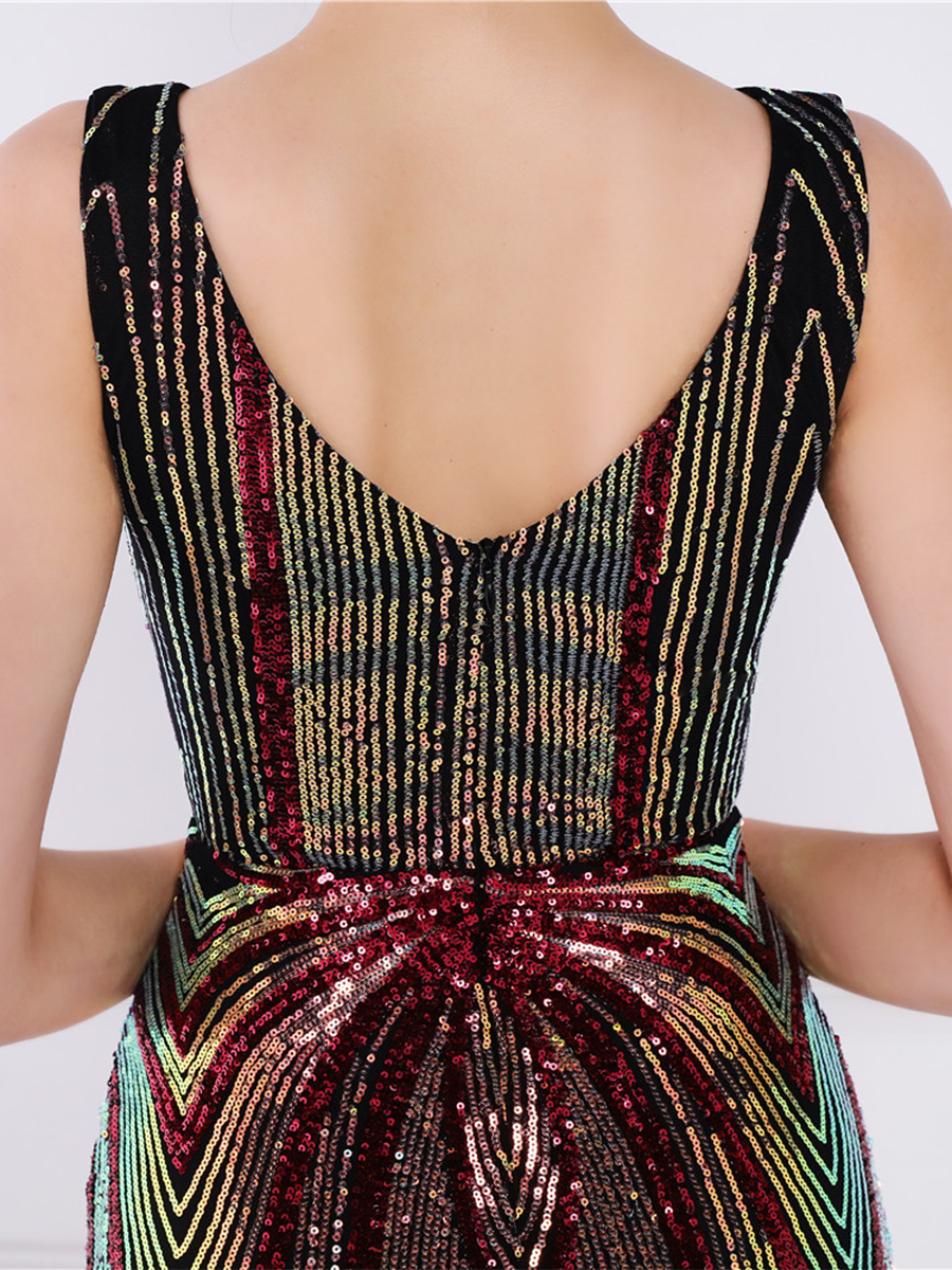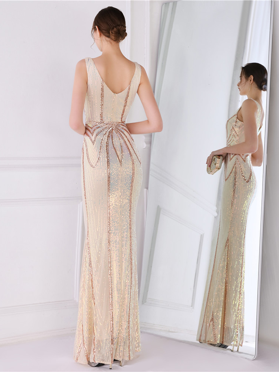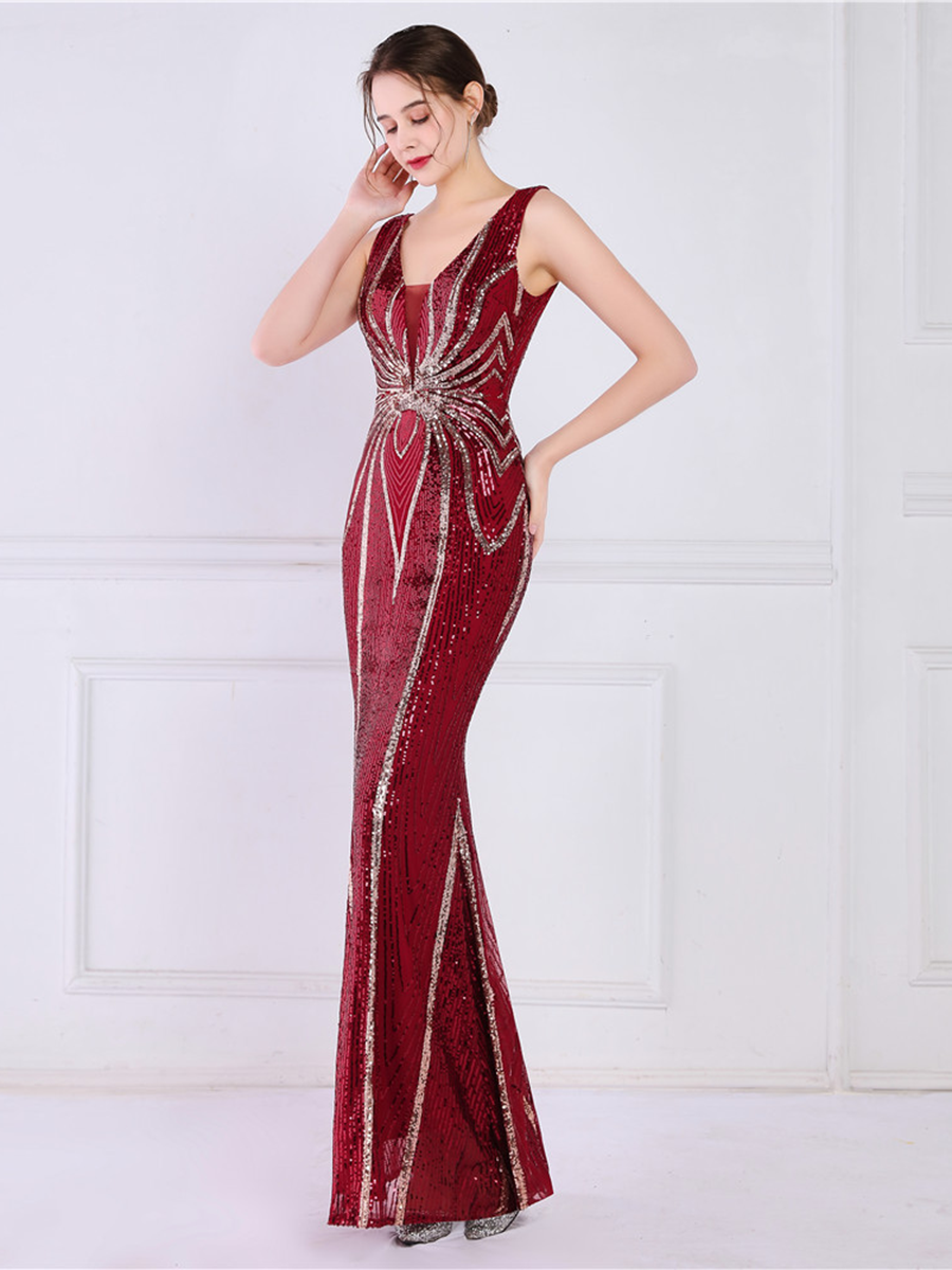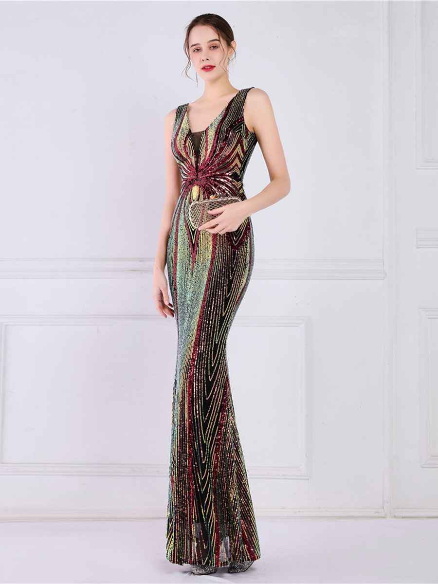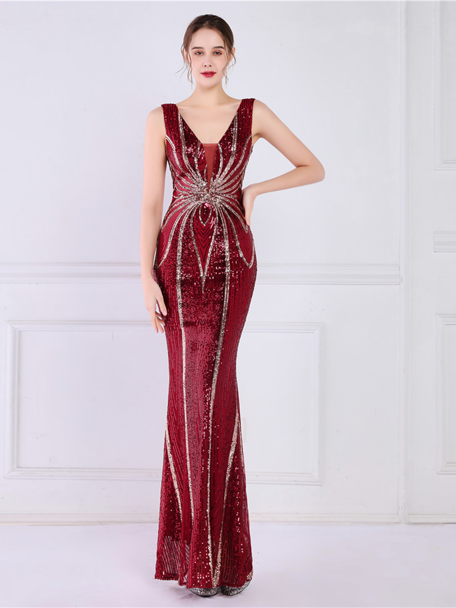 Steal the show in this Sequin Graphic V-neck Prom Dress. With dazzling sequins and a flattering V-neckline. this dress is sure to make heads turn. Perfect for prom. weddings. or any special occasion. Shine bright and sparkle on with this stunning dress!