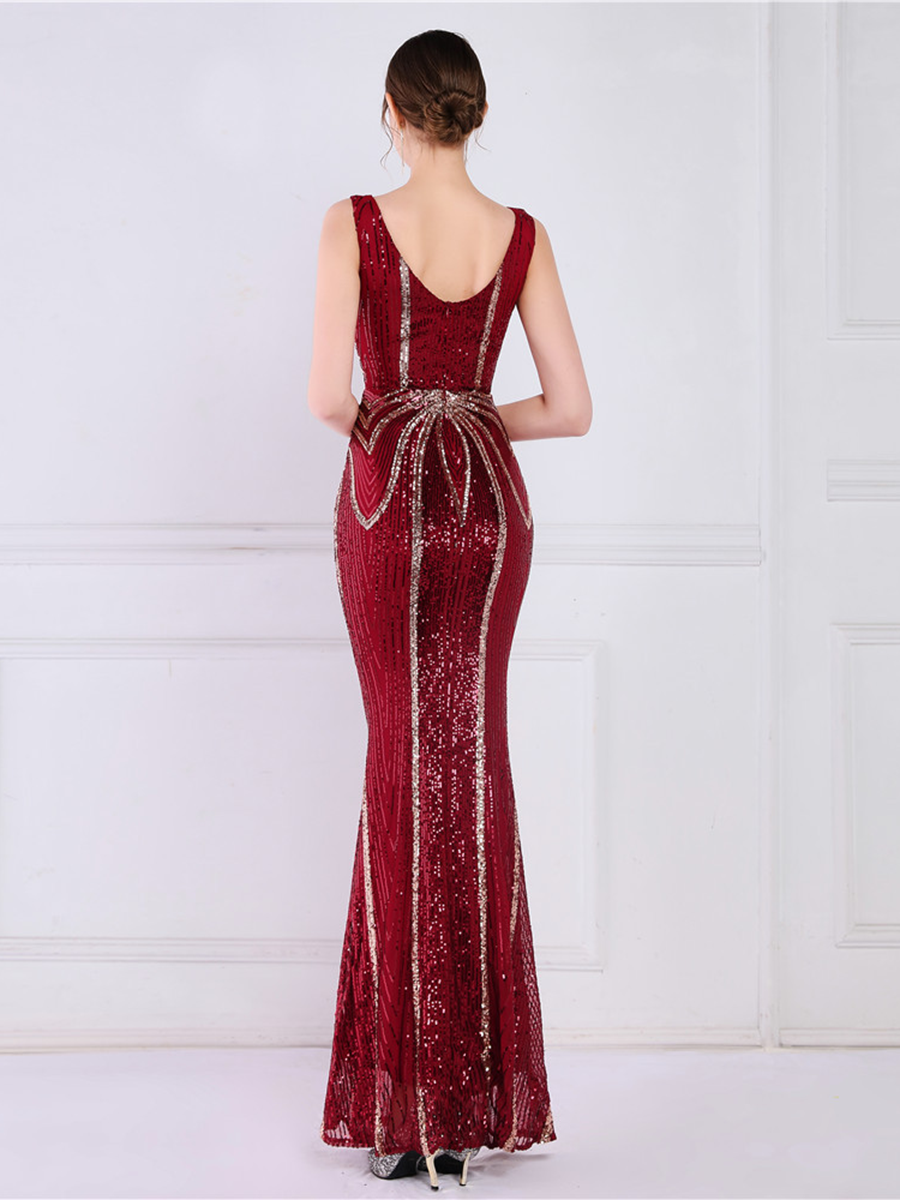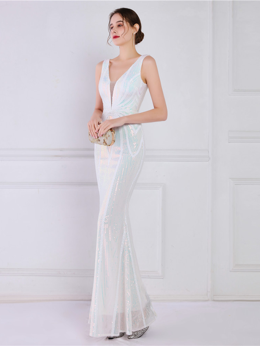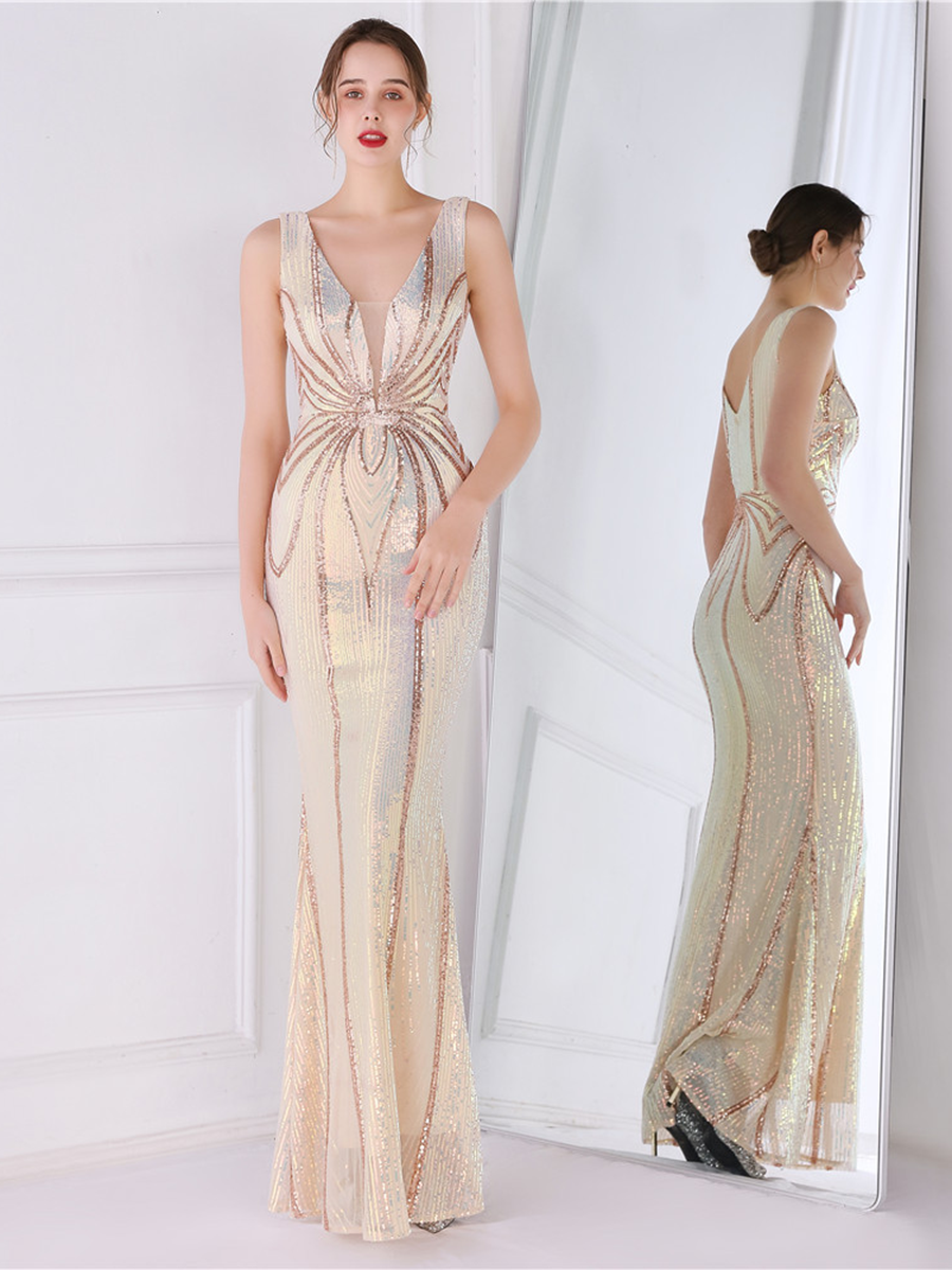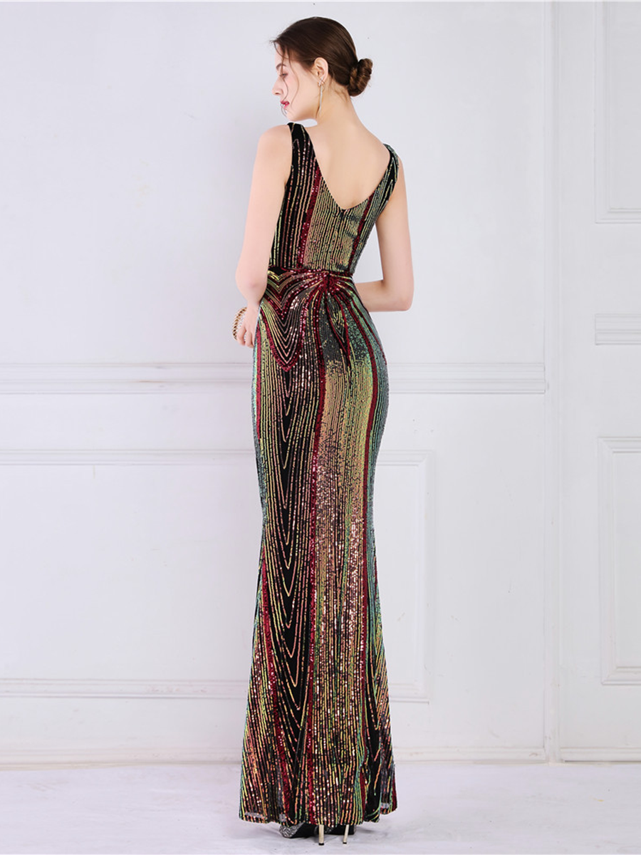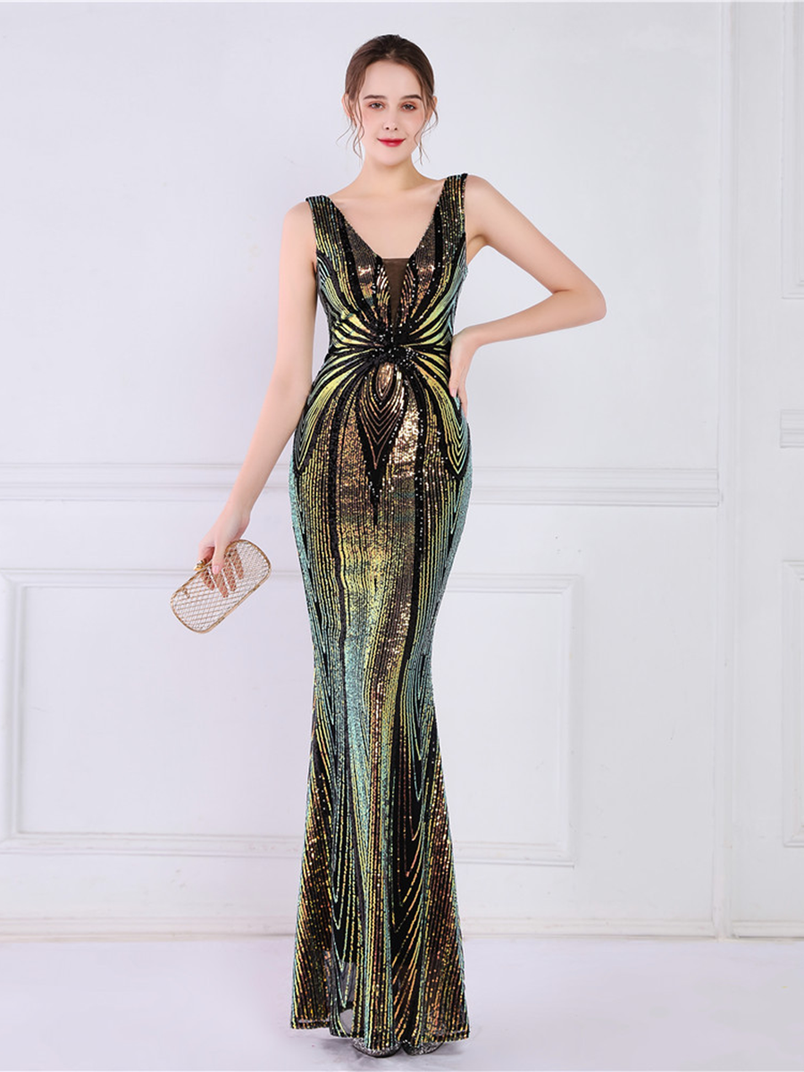 Steal the show in this Sequin Graphic V-neck Prom Dress. With dazzling sequins and a flattering V-neckline. this dress is sure to make heads turn. Perfect for prom. weddings. or any special occasion. Shine bright and sparkle on with this stunning dress!