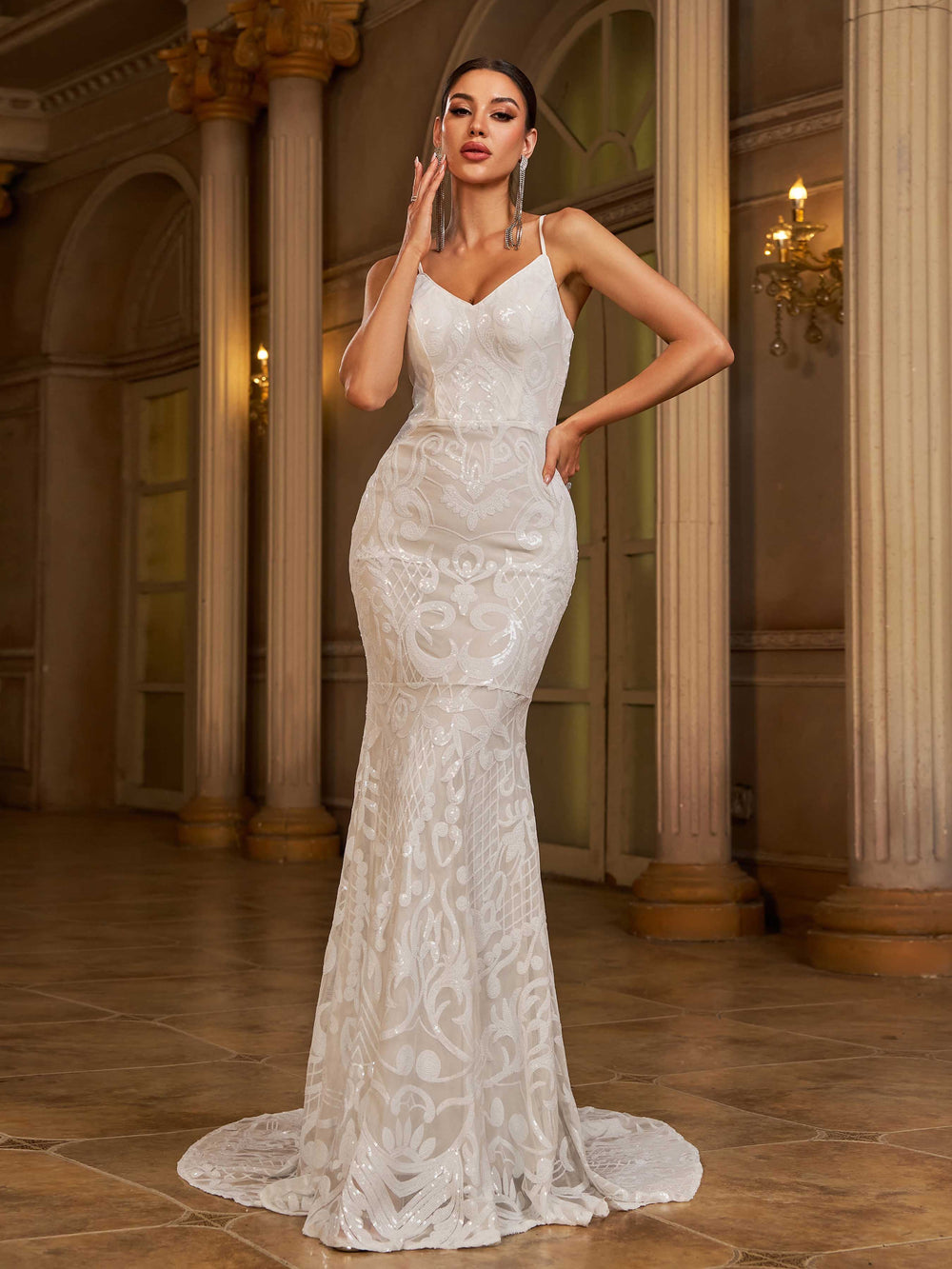 Look fabulous in this spaghetti V neck mermaid white evening dress. The fitted bodice and full skirt creates a stunning silhouette that highlights your curves. The airy fabric keeps you feeling cool while ensuring maximum comfort. A great addition for wardrobe.