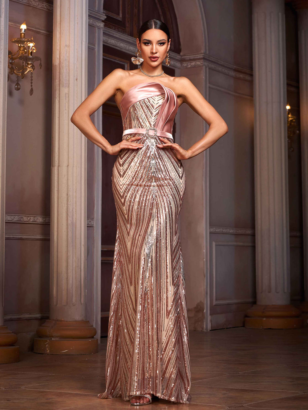 Turn heads effortlessly in this Strapless Colorblock Mermaid Sequin Formal Dress with Belt DH80224. The dazzling sequins catch every light. while the fitted mermaid silhouette highlights your curves. The playful colorblock design adds a fresh twist. and the belt cinches your waist for a perfect fit. Ideal for making a bold statement at any special event!