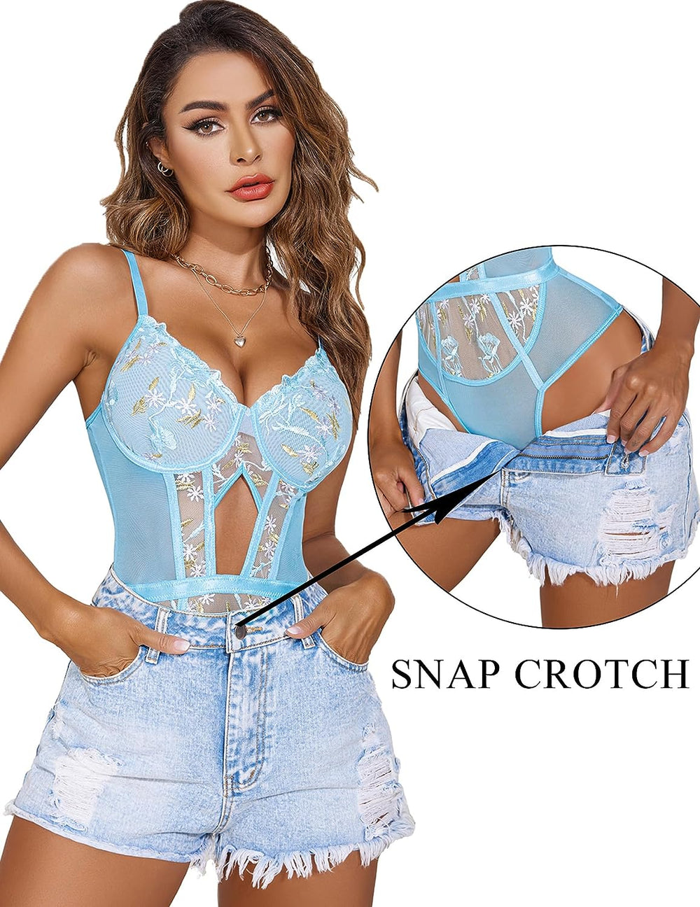 One piece women's lingerie bodysuit with floral embroidered design. removable garter belt. adjustable straps perfectly to show off your curves.