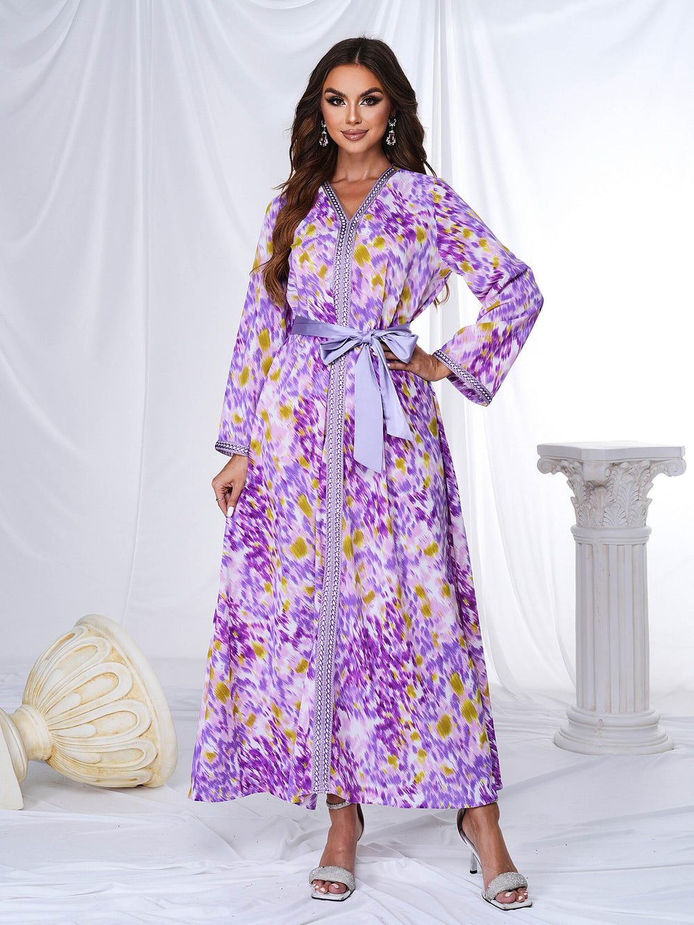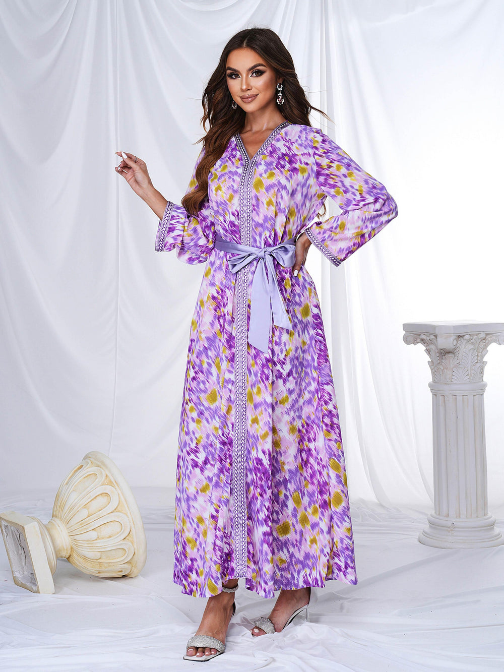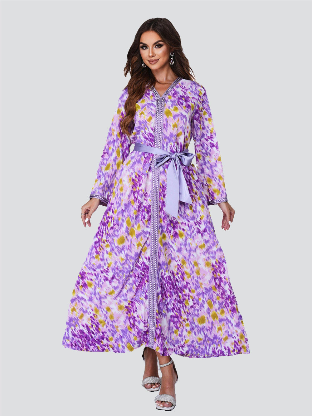 Get ready to bloom in this vibrant V-Neck Flower Printed Purple Maxi Dress. With its eye-catching design and flattering v-neckline. this dress will have you feeling confident and stylish. Perfect for any occasion. from a casual day out to a special event. (Flower crown not included!)