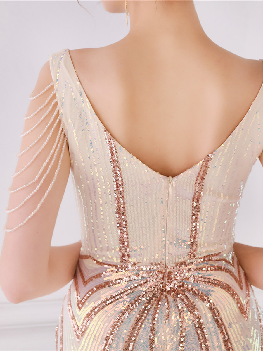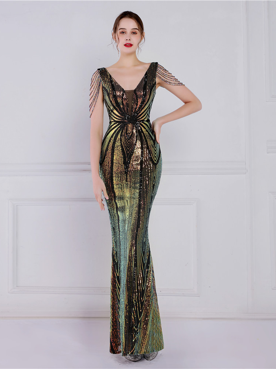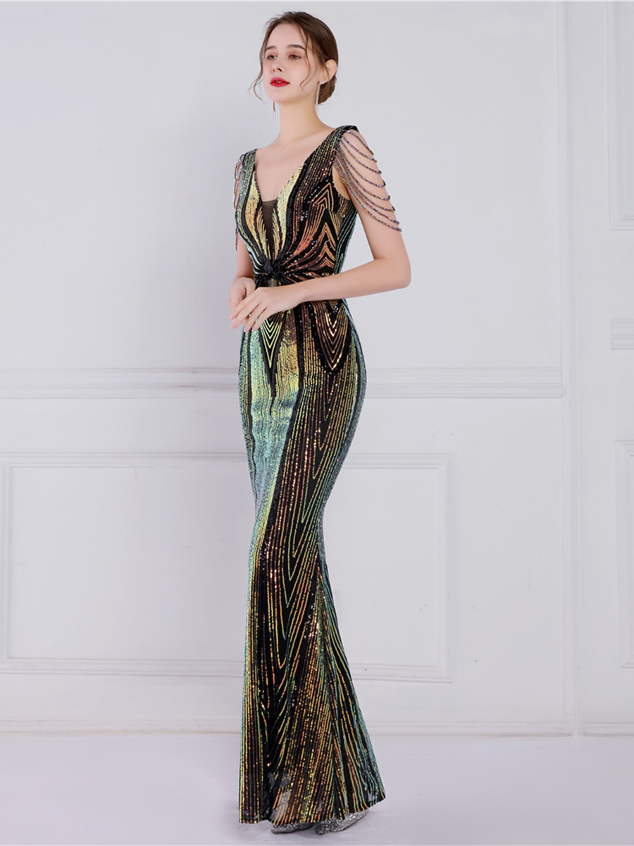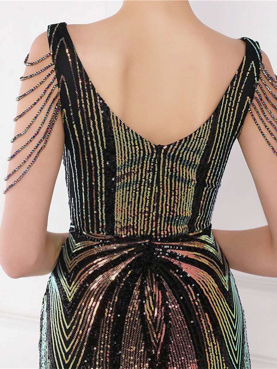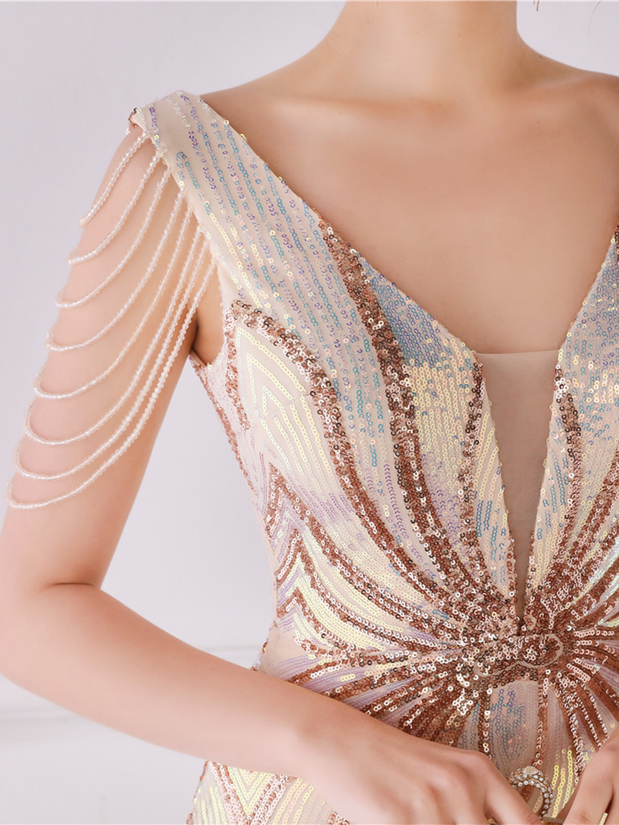 You'll be stunning in any setting in this V Neck Elegant Multicolor Maxi Sequin Prom Dress! Crafted with sequins and a sheath design. this dress has elegance written all over it - and more! So go ahead and twinkle like the star that you are!