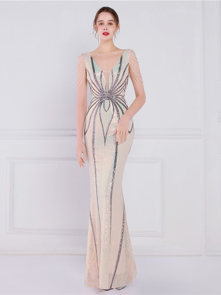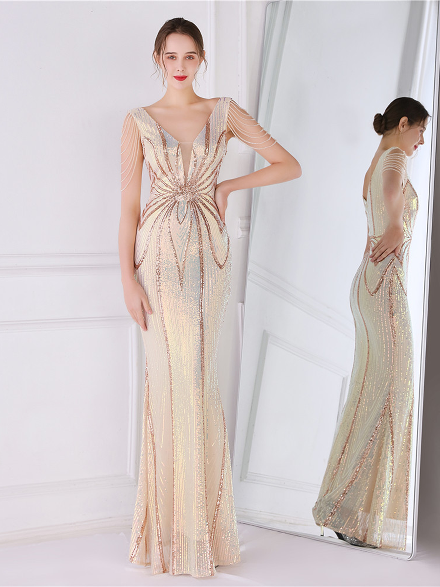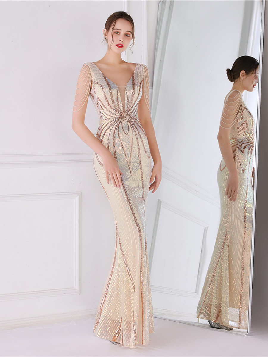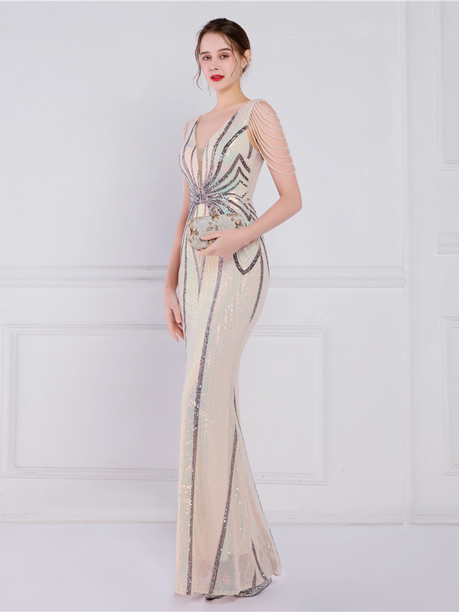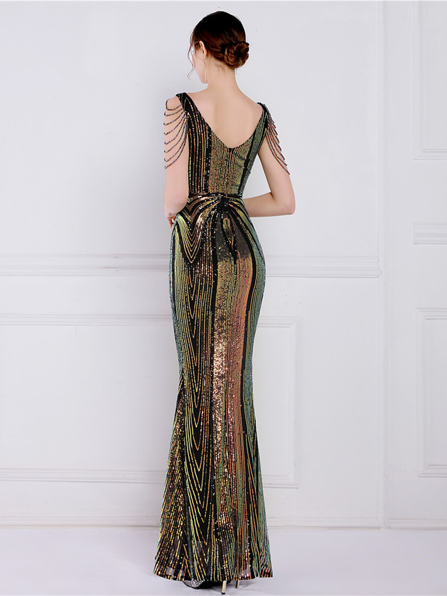 You'll be stunning in any setting in this V Neck Elegant Multicolor Maxi Sequin Prom Dress! Crafted with sequins and a sheath design. this dress has elegance written all over it - and more! So go ahead and twinkle like the star that you are!